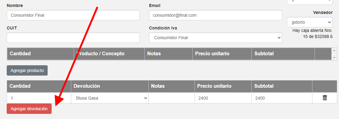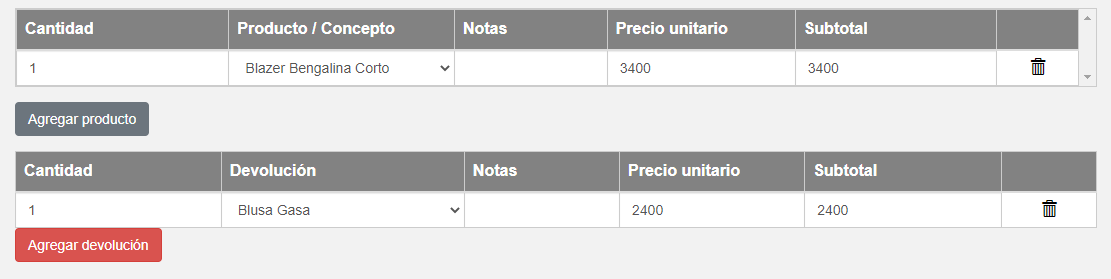 Otra opción posible tomar el cambio y darle al cliente otro producto. En este caso, se devuelve una Blusa por $2400, y el cliente se lleva un Blazer de $3400.