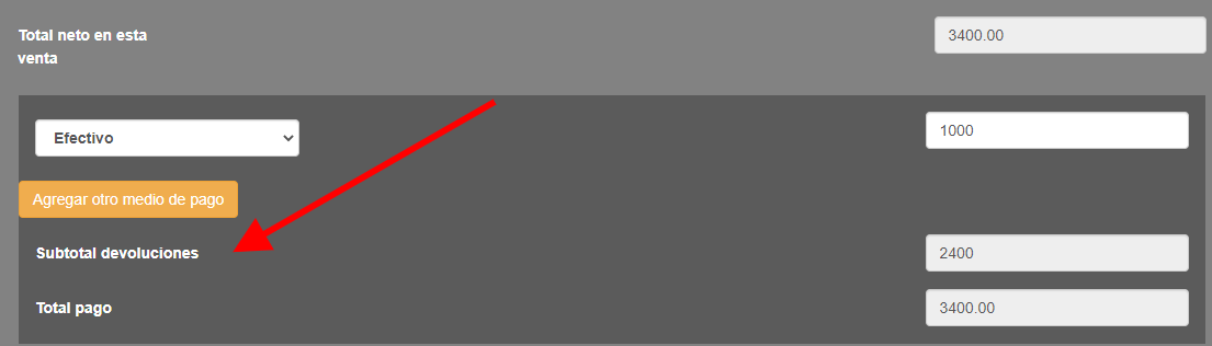 Como el producto que se lleva es de $3400, después de imputar el cambio por $2400 debe agregar $1000 por otro medio de pago para completar el importe de la venta.