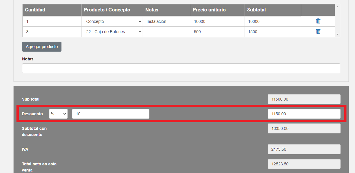 Las ventas pueden tener descuentos por varias razones, en tal caso se pueden especificar en el tipo de descuento % o $, y luego un valor. En este ejemplo, una venta que se facturará con A, tiene especificado el 21% de IVA.