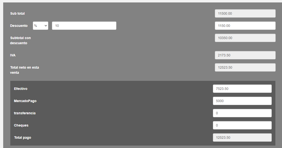 Las ventas pueden tener varios medios de pago. En este caso registramos que se pagó $7523.50 en efectivo y $5000 por MercadoPago.