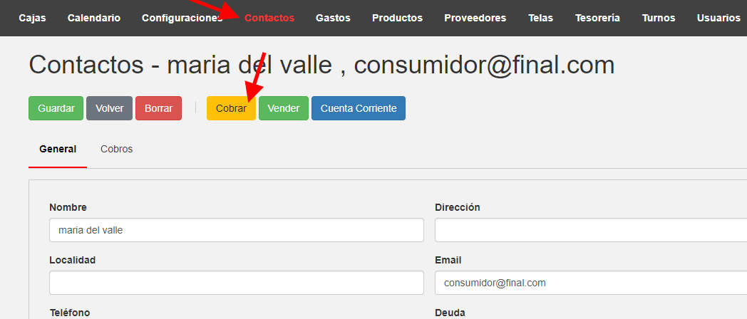 La segunda forma de acceder a la pantalla Cobrar es desde Contactos, editando el contacto al que queremos cobrarle.
