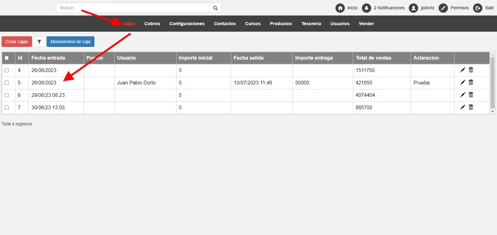 Las Cajas se abren automáticamente cuando un usuario hace una venta en el puesto de caja, y se Cierran sólo cuando el usuario produce el cierre. Cuando están abiertas, muestran un resumen en el mismo puesto de ventas.