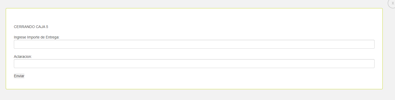 Para Cerrar una caja, se debe hacer click en esa alerta, entonces el sistema dejará la posibilidad de ingresar el importe de entrega en efectivo, y alguna aclaración necesaria.