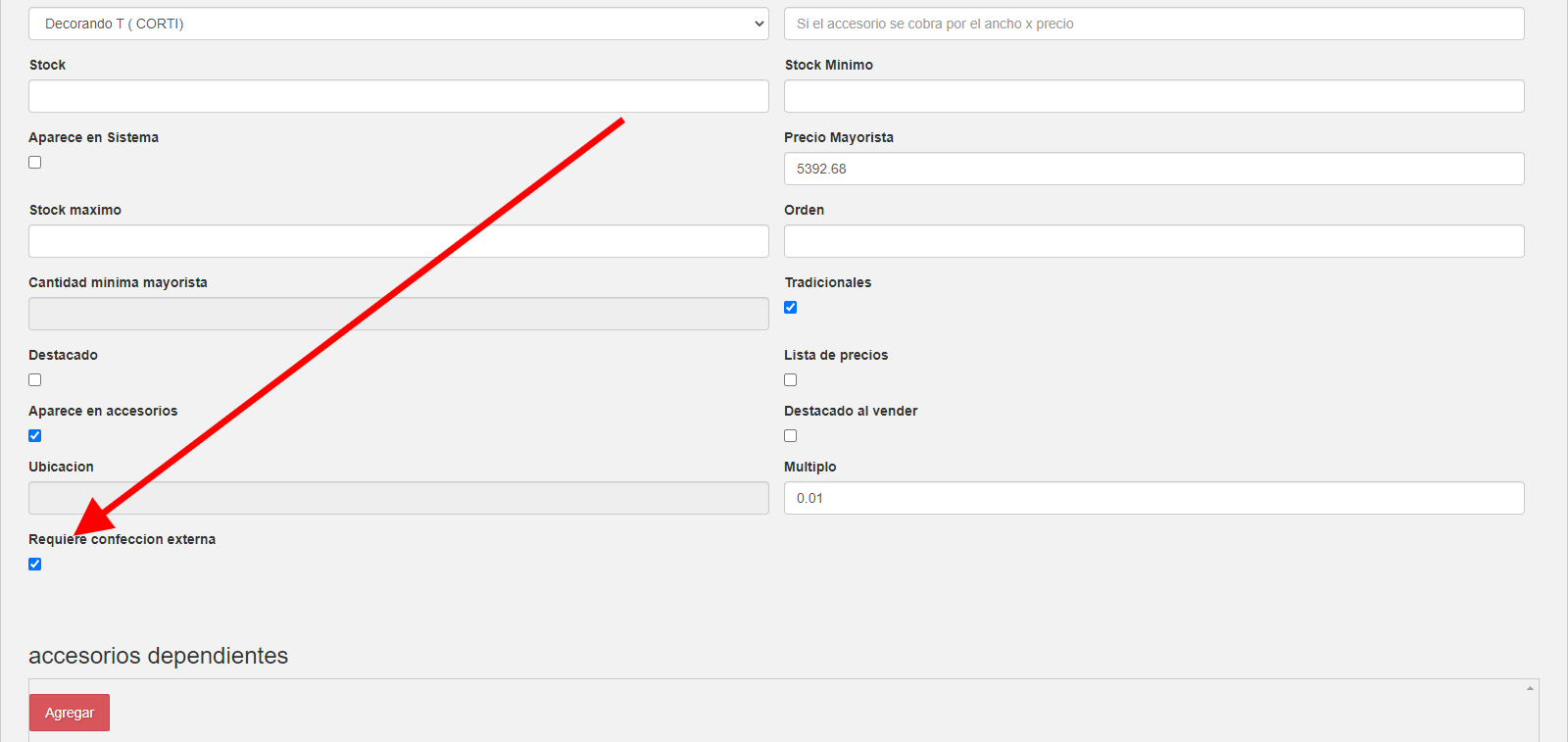 Dentro de cada producto hay un campo cuyo nombre es "Requiere Confeccion externa" .