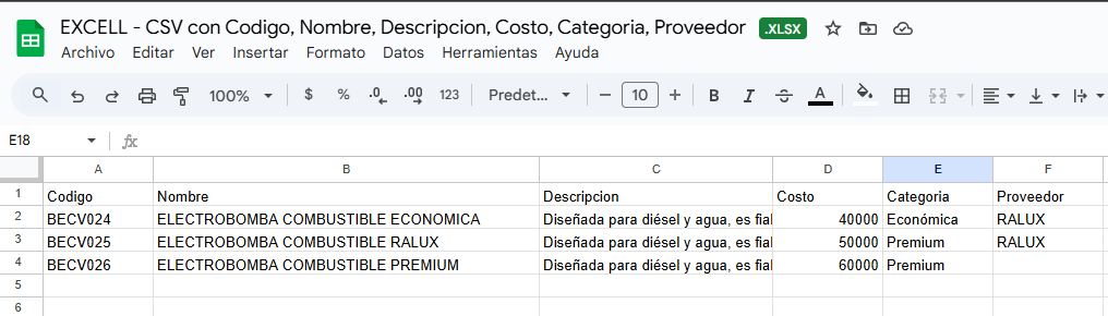 1. Bajar el archivo de Excell modelo desde la ubicación : EXCELL - CSV con Codigo, Nombre, Descripcion, Costo, Categoria, Proveedor.xlsx