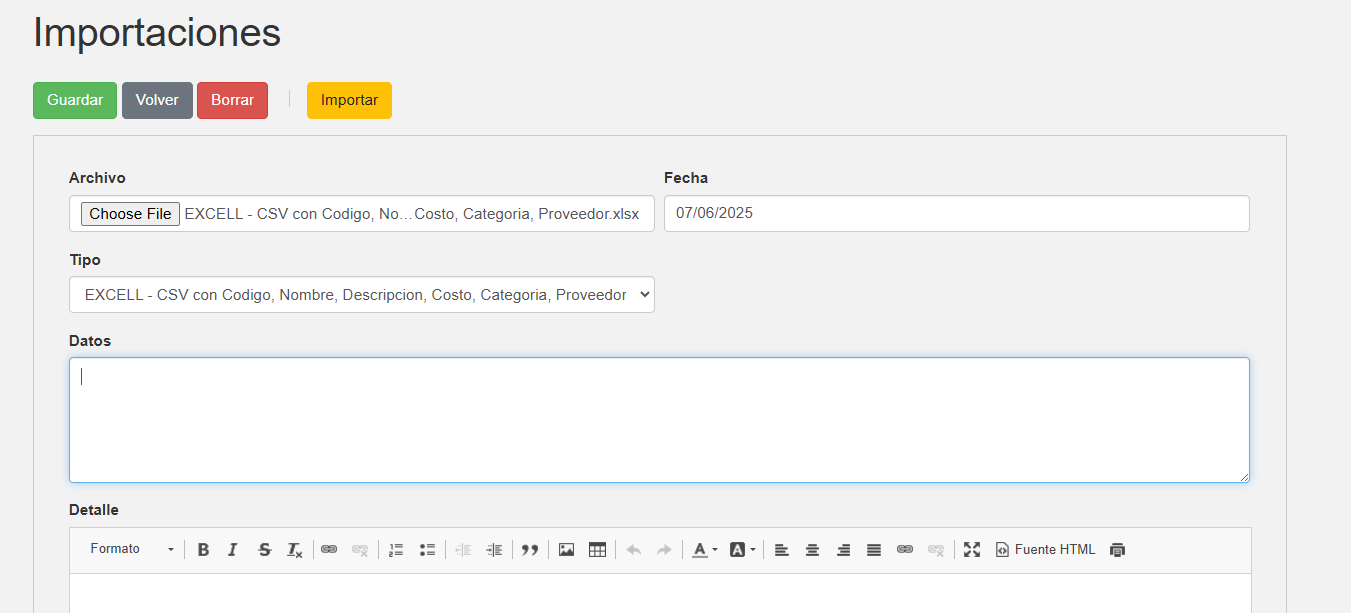 4. Crear Importación seleccionando el tipo EXCELL - CSV con Codigo, Nombre, Descripcion, etc, la fecha actual y el archivo