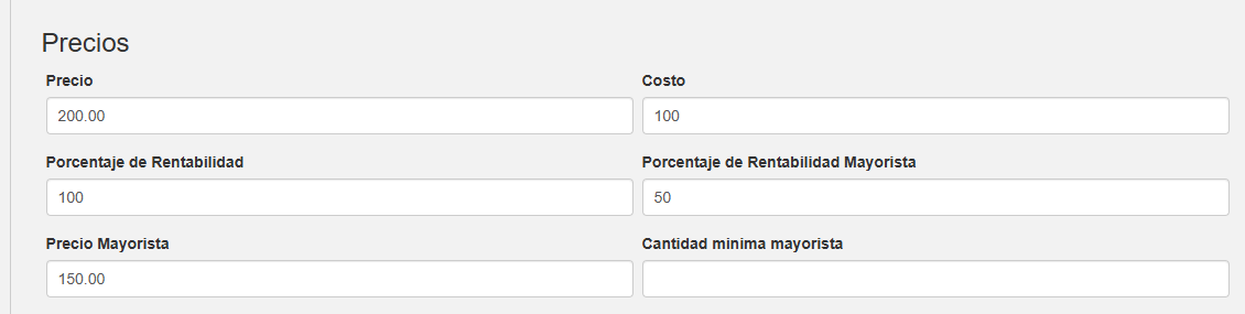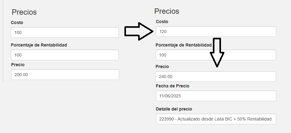 Por ejemplo, si el producto Lapicera cuesta $100 en la lista del proveedor y nosotros lo queremos poner a la venta en $200, el campo Porcentaje de Rentabilidad debería ser de 100. Si queremos ofrecer un precio de $150 para mayoristas, el Porcentaje de Rentabilidad Mayorista debería ser 50.