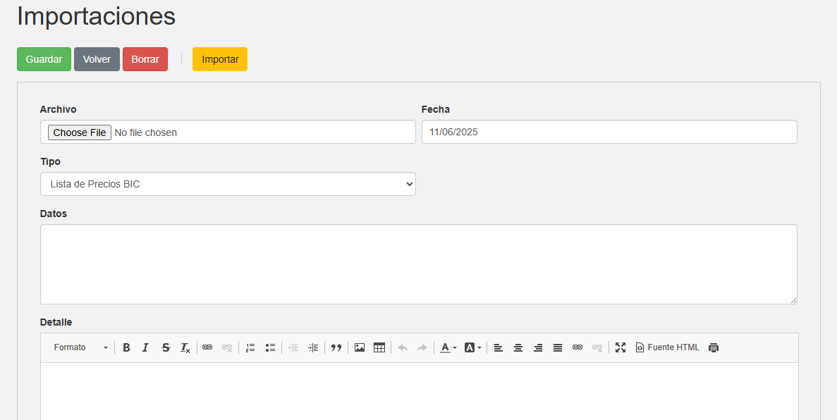 2. En Tipo elegimos Lista de Precios BIC, en Fecha cargamos la fecha que representa ese cambio de precios y en Archivo el archivo XLS o CSV de la lista de precios de nuestro proveedor.
