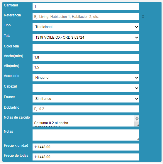En este ejemplo se puede ver cómo un cotizador del producto Cortina llega al precio de $111448 por una cortina tradicional de 1.8 x 1.5, eligiendo una tela Oxford. Como el cotizador está siendo utilizado desde el administrador interno de una Tienda, también se puede ver las Notas de cálculo, que son anotaciones que produce automáticamente el sistema. Si visitasemos el cotizador como un cliente desde la web, no veríamos estas notas de cálculo.