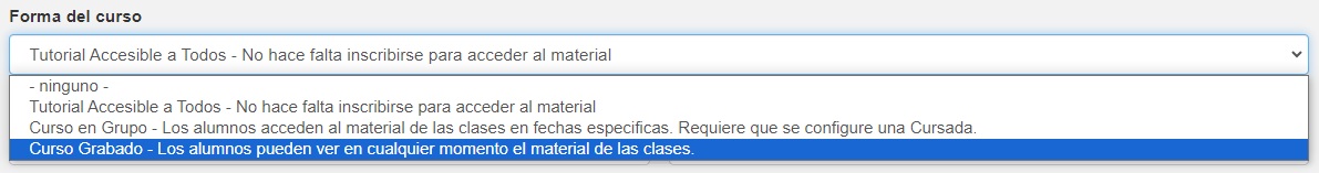 Forma del Curso: La forma del curso es un valor interno que no se muestra a los alumnos, pero que define la forma en la que la plataforma va a presentar el contenido de ese curso a los alumnos.
