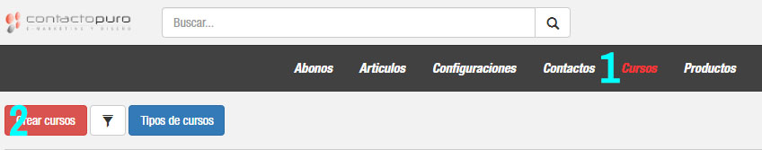 Para empezar ingresamos a nuestro administrador, luego a la sección "Cursos", hacemos click en el botón "Crear cursos" y empezamos a completar los campos correspondientes.