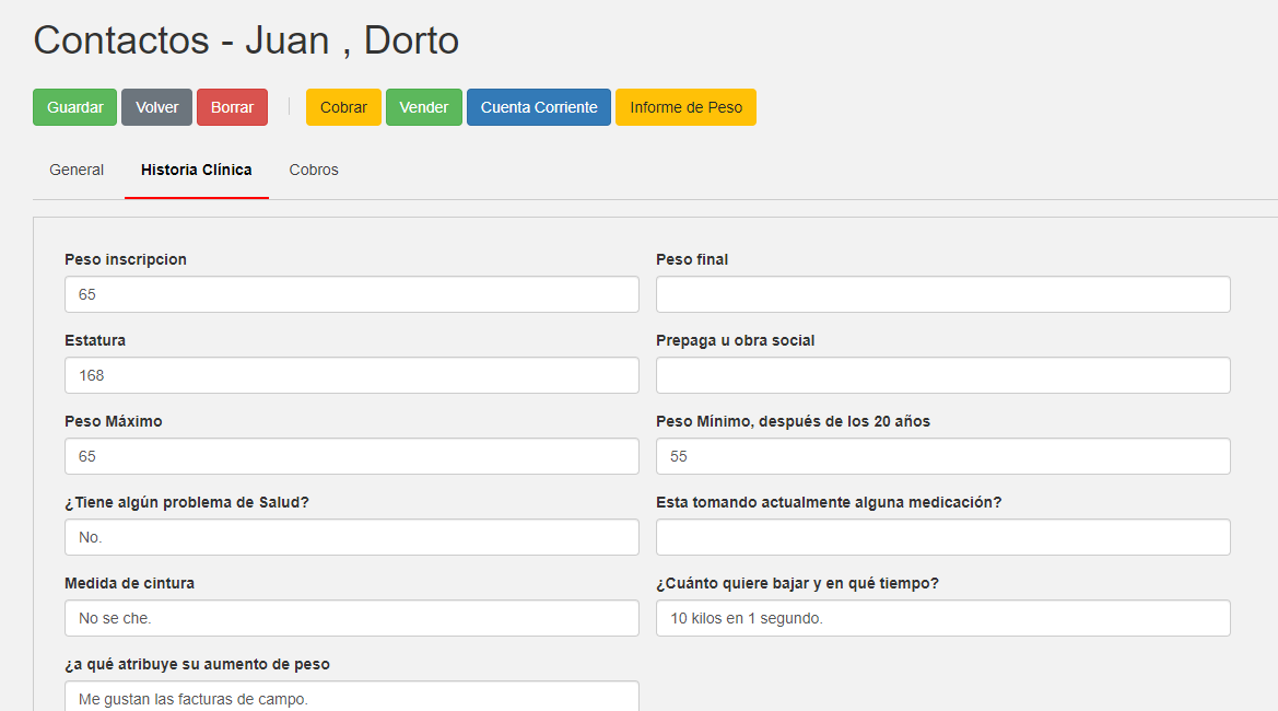 En la pestaña "General" vas a encontrar todos los datos de nombre y apellido, edad y contacto generales de cualquier contacto, pero dentro de la pestaña "Historia Clínica" habrá otros campos con información específica de la Historia Clínica de cada paciente.