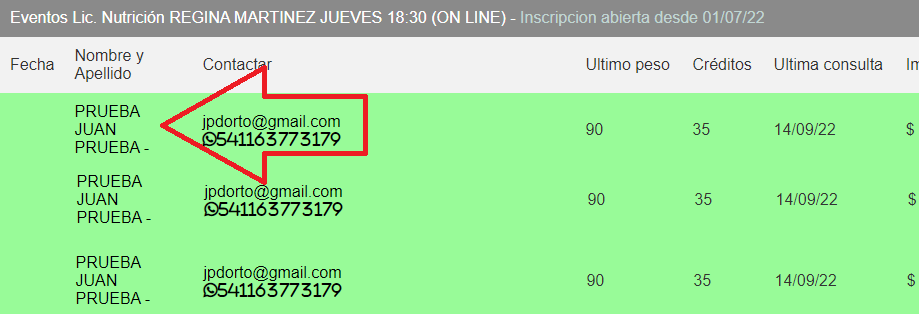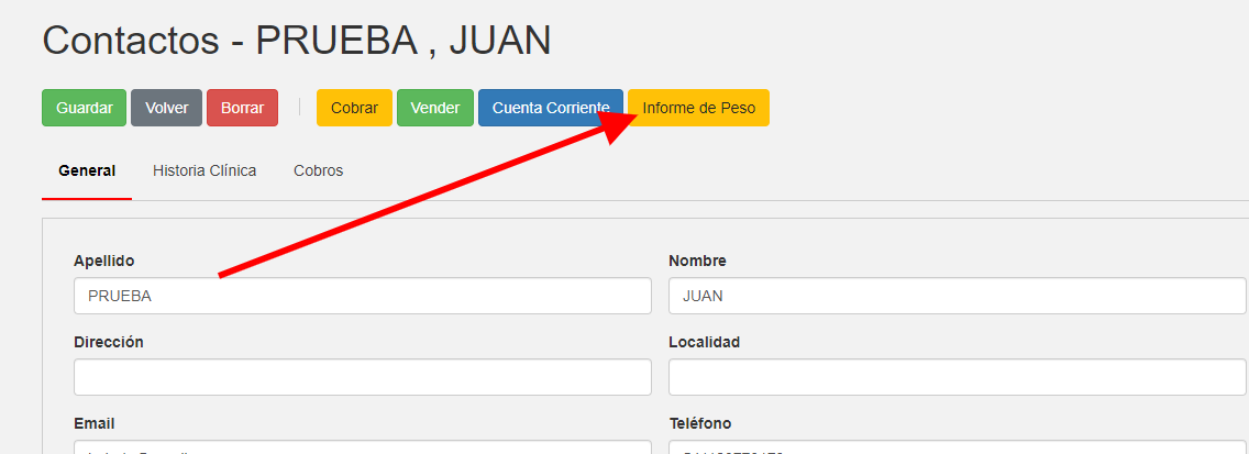 Una vez abierta la pantalla de contacto, debemos buscar el botón amarillo Informe de Peso.
