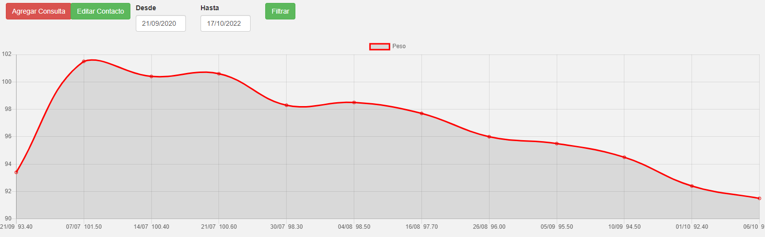 El Informe de Peso produce un gráfico de líneas con el peso del paciente en cada consulta. En el eje inferior se puede ver la fecha y el peso al que llegó cada paciente. Si el paciente tiene cargada la estatura, también se va formando el IMC.