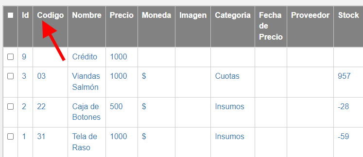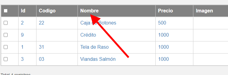 Al hacer click en el nombre de la columna, la tabla de Productos se ordena alfabéticamente por ese campo. En este caso, se ordena por el orden de los Códigos.