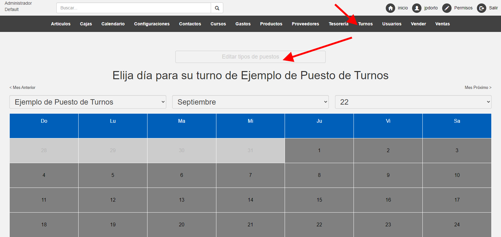Para comenzar a configurar los puestos, debemos ir a Turnos y Luego a Editar Tipos de Puestos.