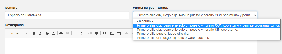 Además, en la figura aparece un campo llamado Descripción donde podemos completar los detalles del servicio que vamos a estar brindando, y un campo en especial llamado Forma de pedir turnos, en el que podemos elegir entre estas opciones: