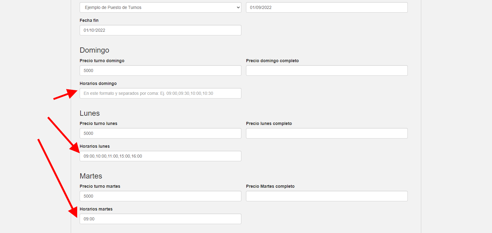 En este ejemplo, en cada día de este período se puede especificar distintos horarios. Los domingos no habrá ningún turno disponible. Los lunes se podrá sacar turnos a las 9:00, 10:00, 11:00,15:00 y 16:00. Los martes, sólo a las 09:00.