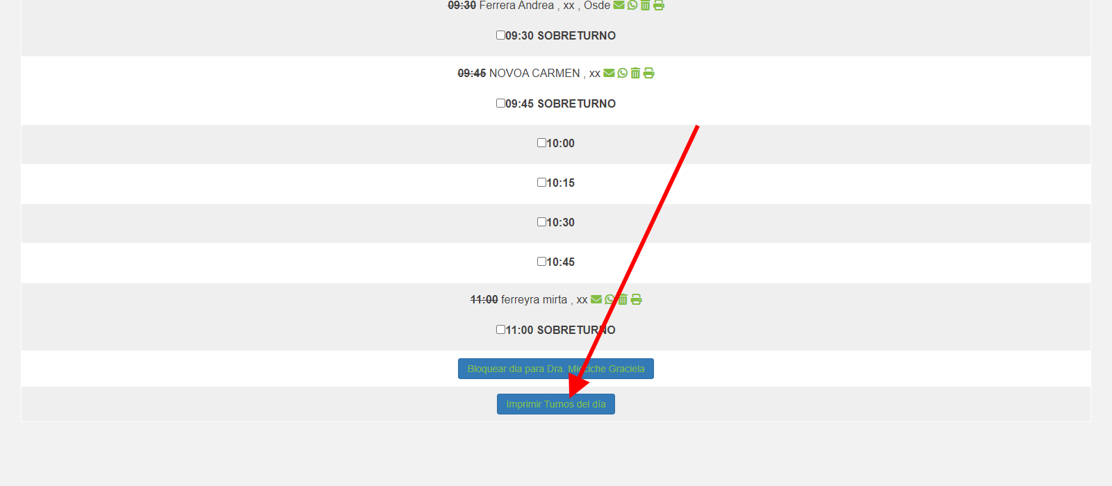 Abajo de todo el turnero del día, hay un botón "Imprimir Turnos del día". Esta opción sólo está disponible accediendo desde el administrador. Los usuarios que sacan su turno desde la web no tienen acceso a este botón.