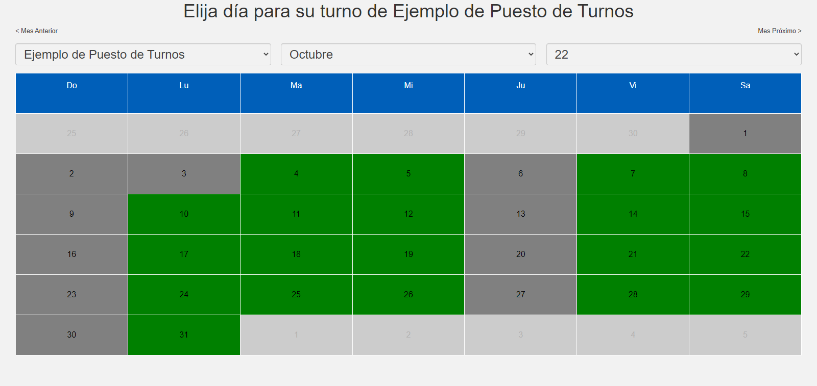 En la pantalla de inicio de Turnos, podrás seleccionar Puesto, Mes y Año y podrás ver los días que tienen turnos disponibles y los que no.